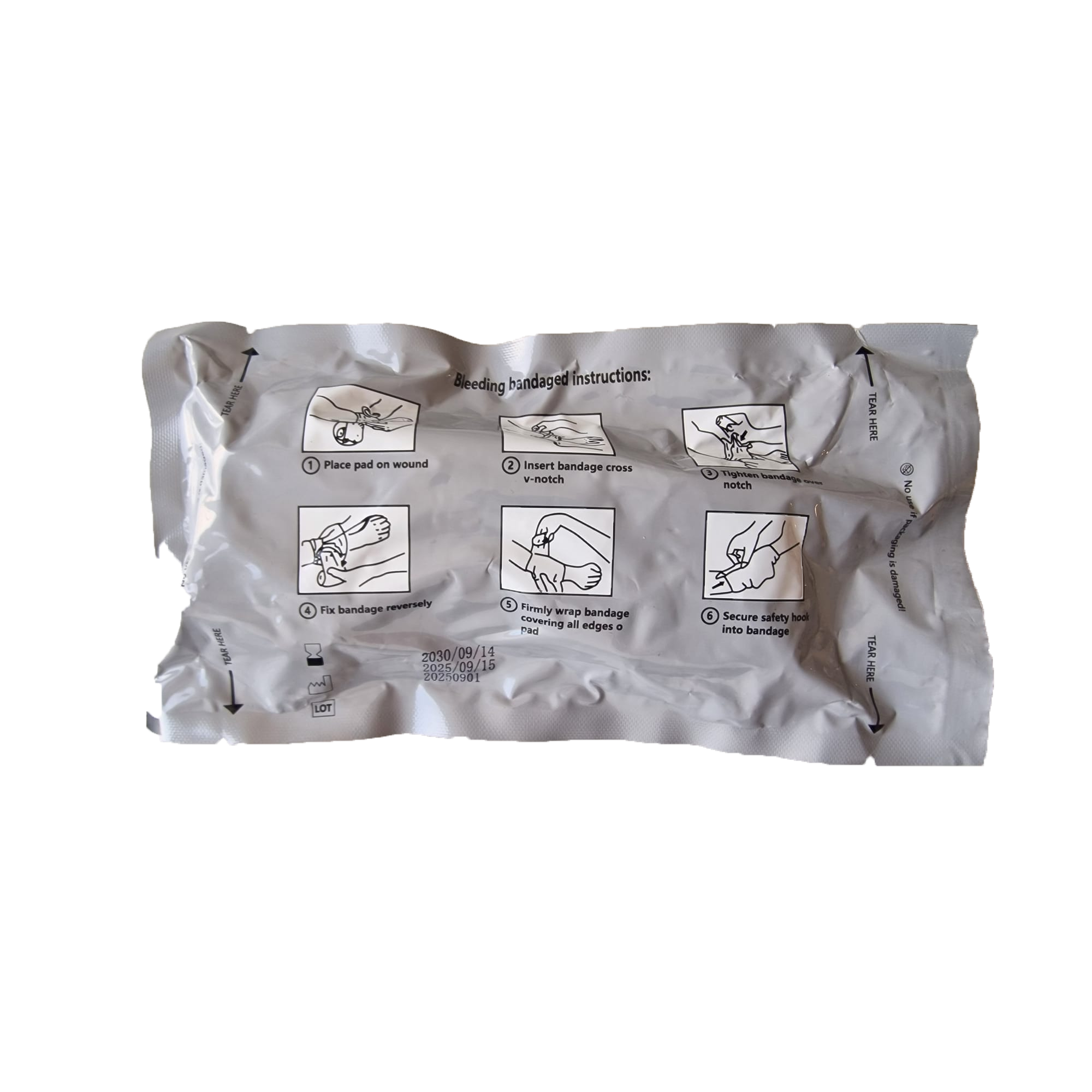 Diese Bandage stammt aus dem Bereich TCCC/TECC und ist für die taktische Traumaversorgung konzipiert. Der breite Emergency- bzw. Israeli-Verband kombiniert mehrere Funktionen in einem einzigen Druckverband und verfügt über eine stark saugfähige Wundauflage für stark blutende Verletzungen. Er eignet sich zur Versorgung schwerer Wunden an Armen und Beinen sowie im Kopf- und Halsbereich.