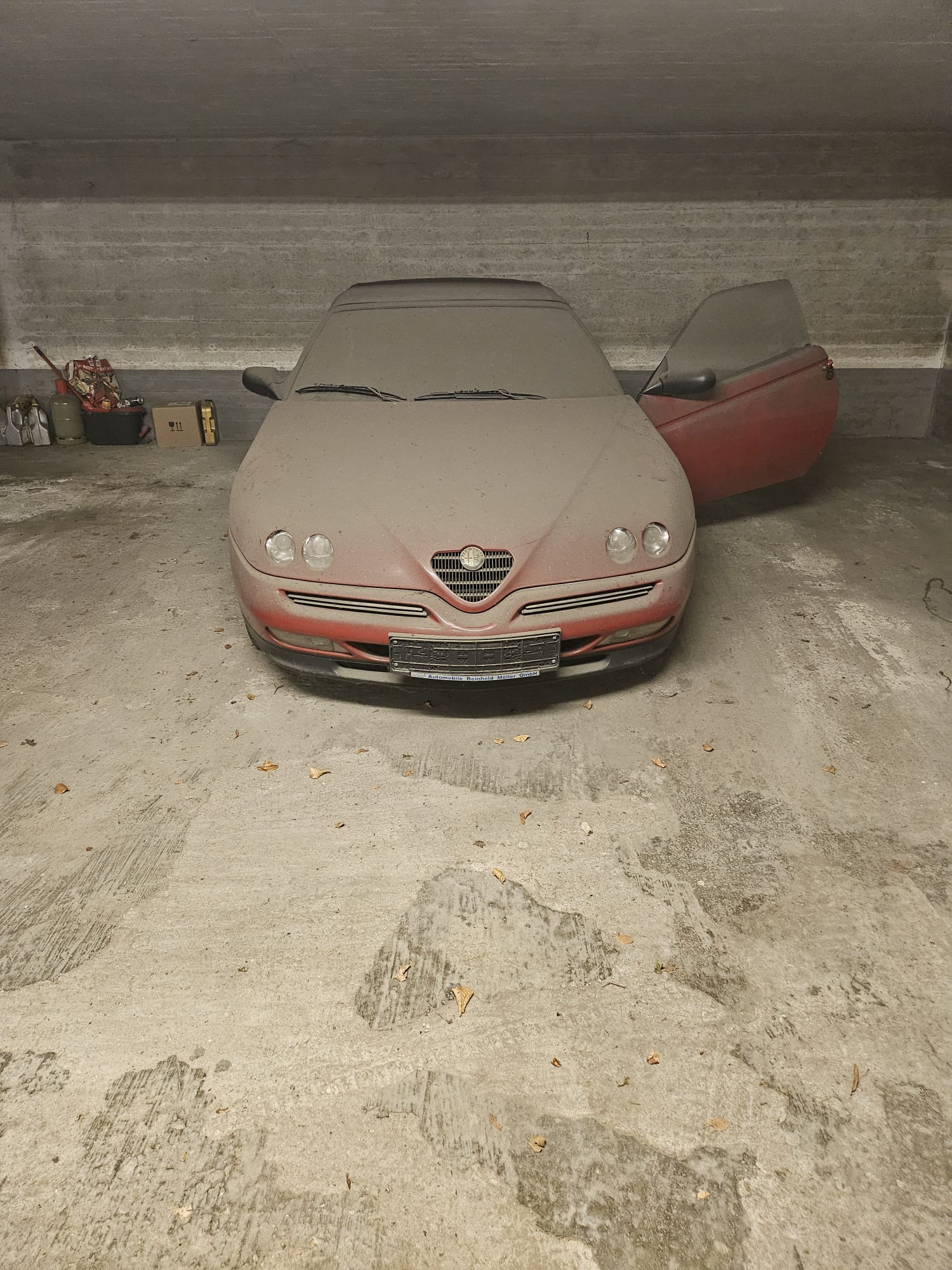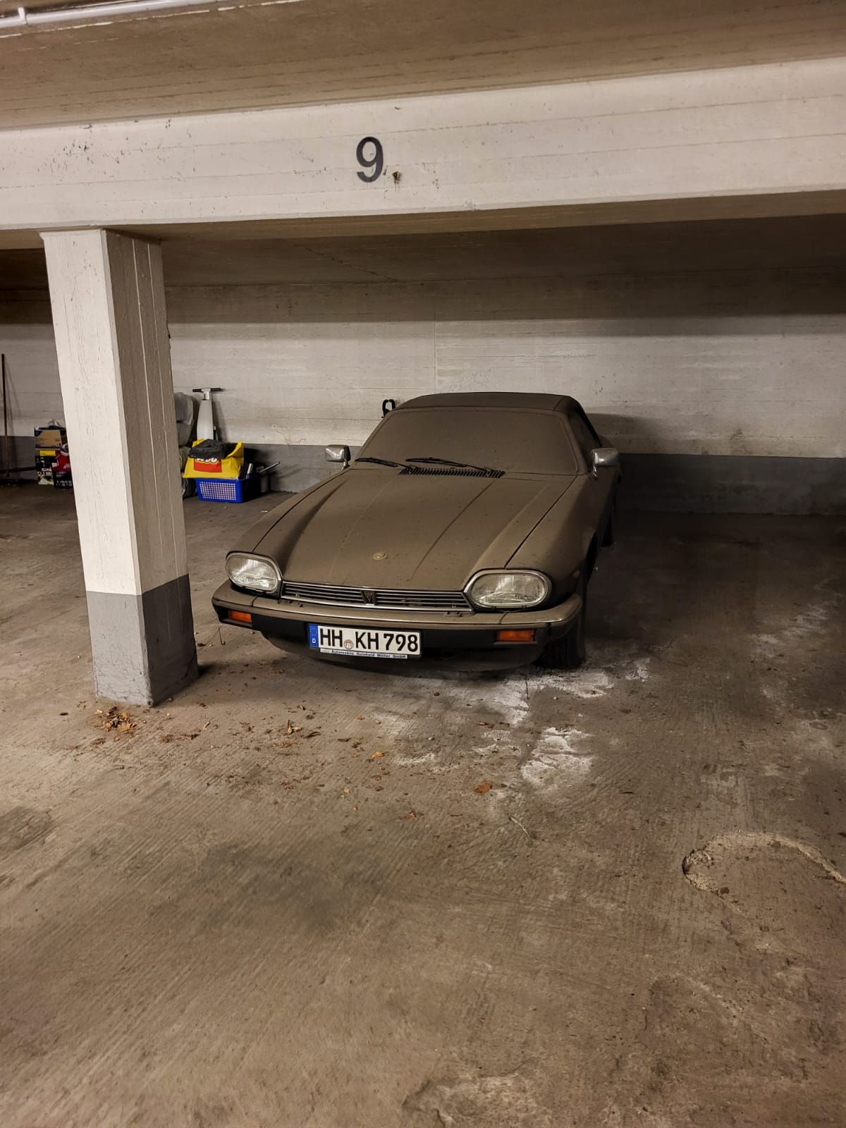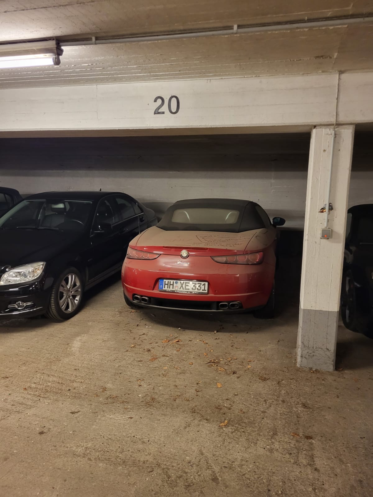Die Tiefgarage ist nummeriert, betoniert und eher schlicht, mit engen Stellplätzen. Neben den Fahrzeugen sind vereinzelt Motorräder und moderne Autos zu sehen, was den Kontrast zwischen Alltagsfahrzeugen und Sammlerautos verstärkt.