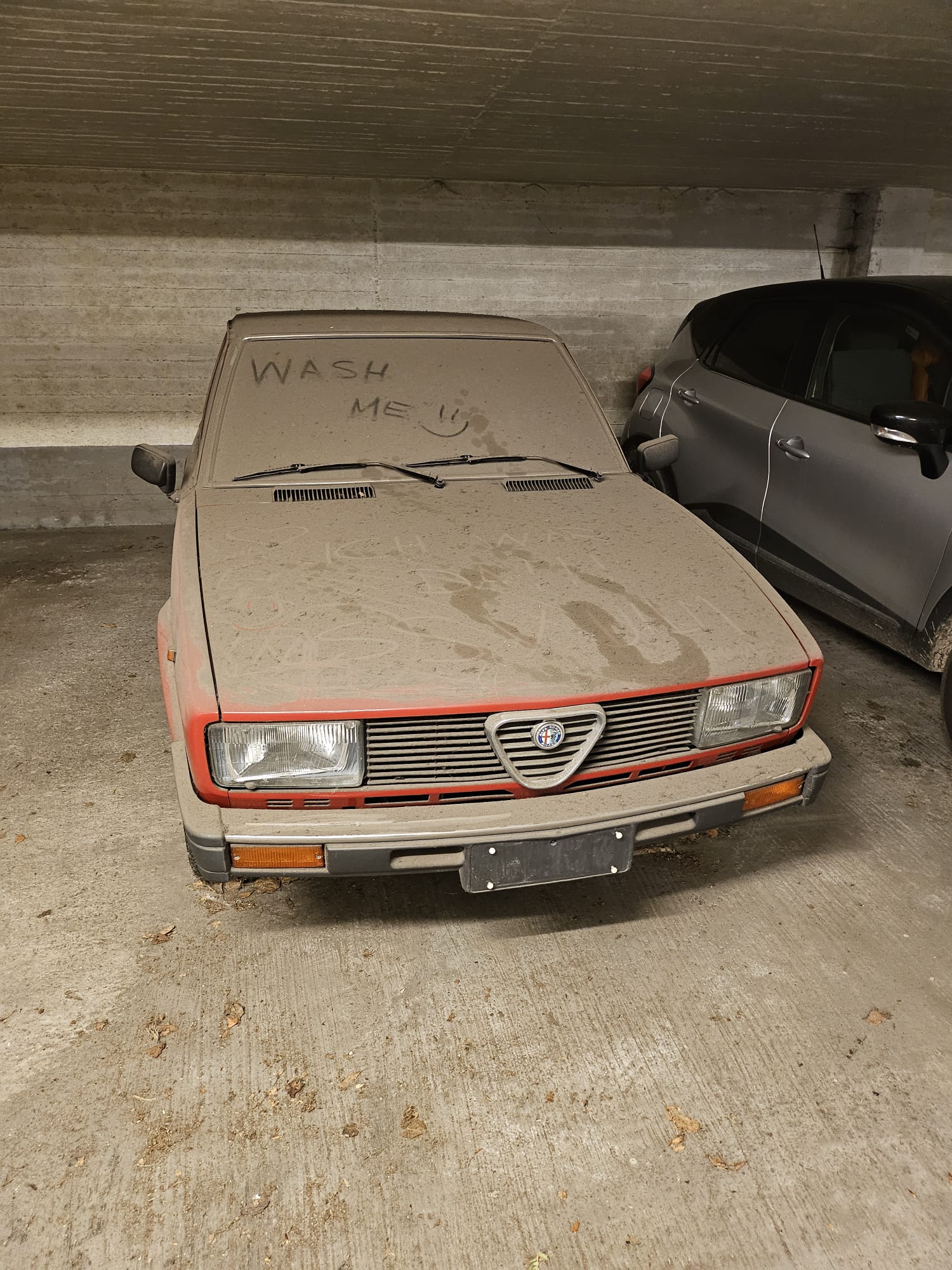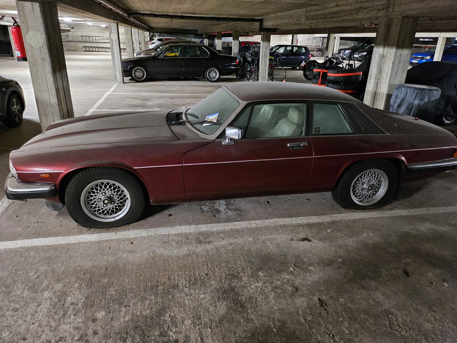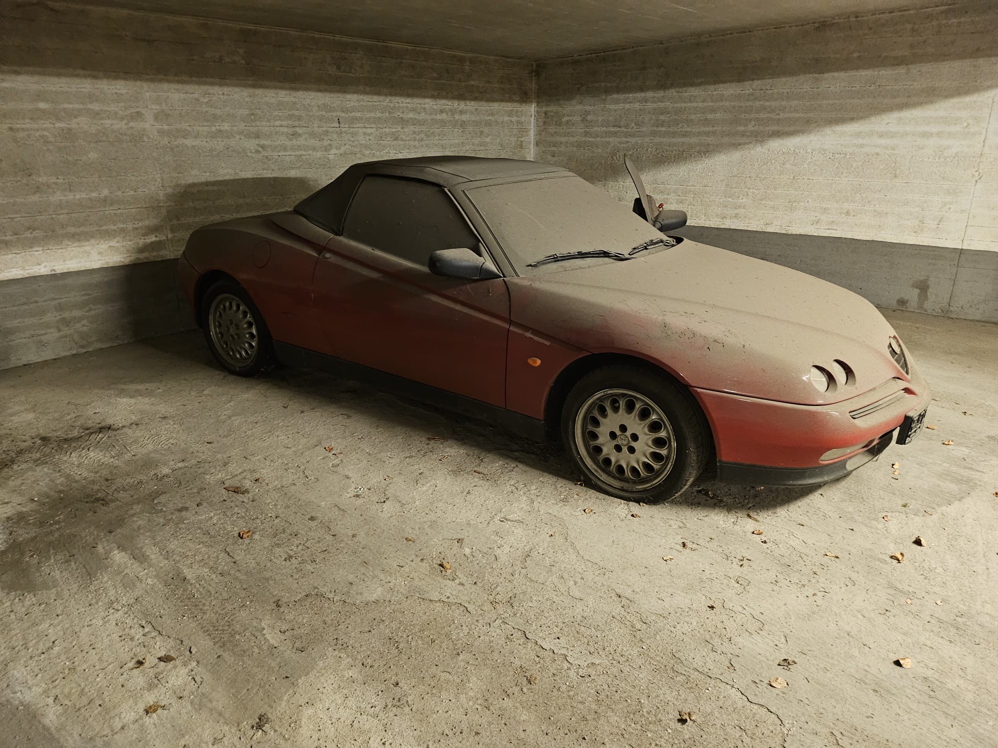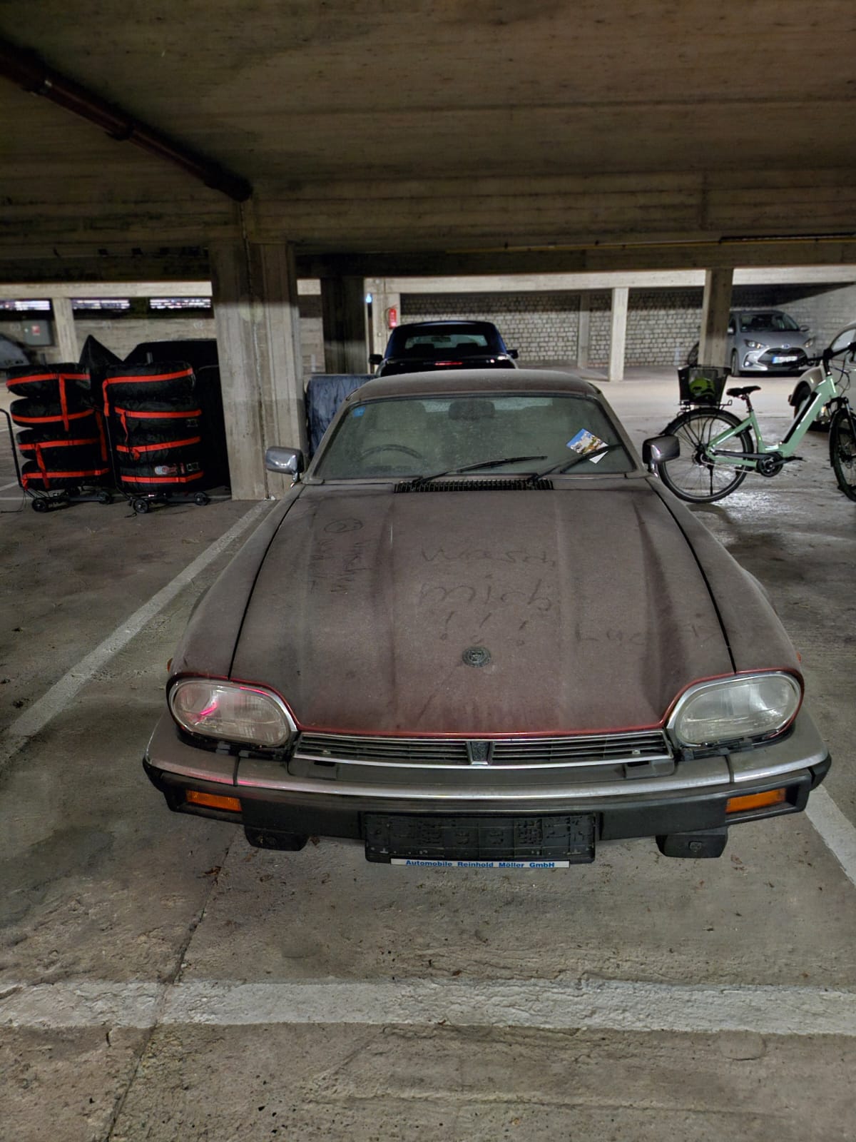 Die Tiefgarage ist nummeriert, betoniert und eher schlicht, mit engen Stellplätzen. Neben den Fahrzeugen sind vereinzelt Motorräder und moderne Autos zu sehen, was den Kontrast zwischen Alltagsfahrzeugen und Sammlerautos verstärkt.