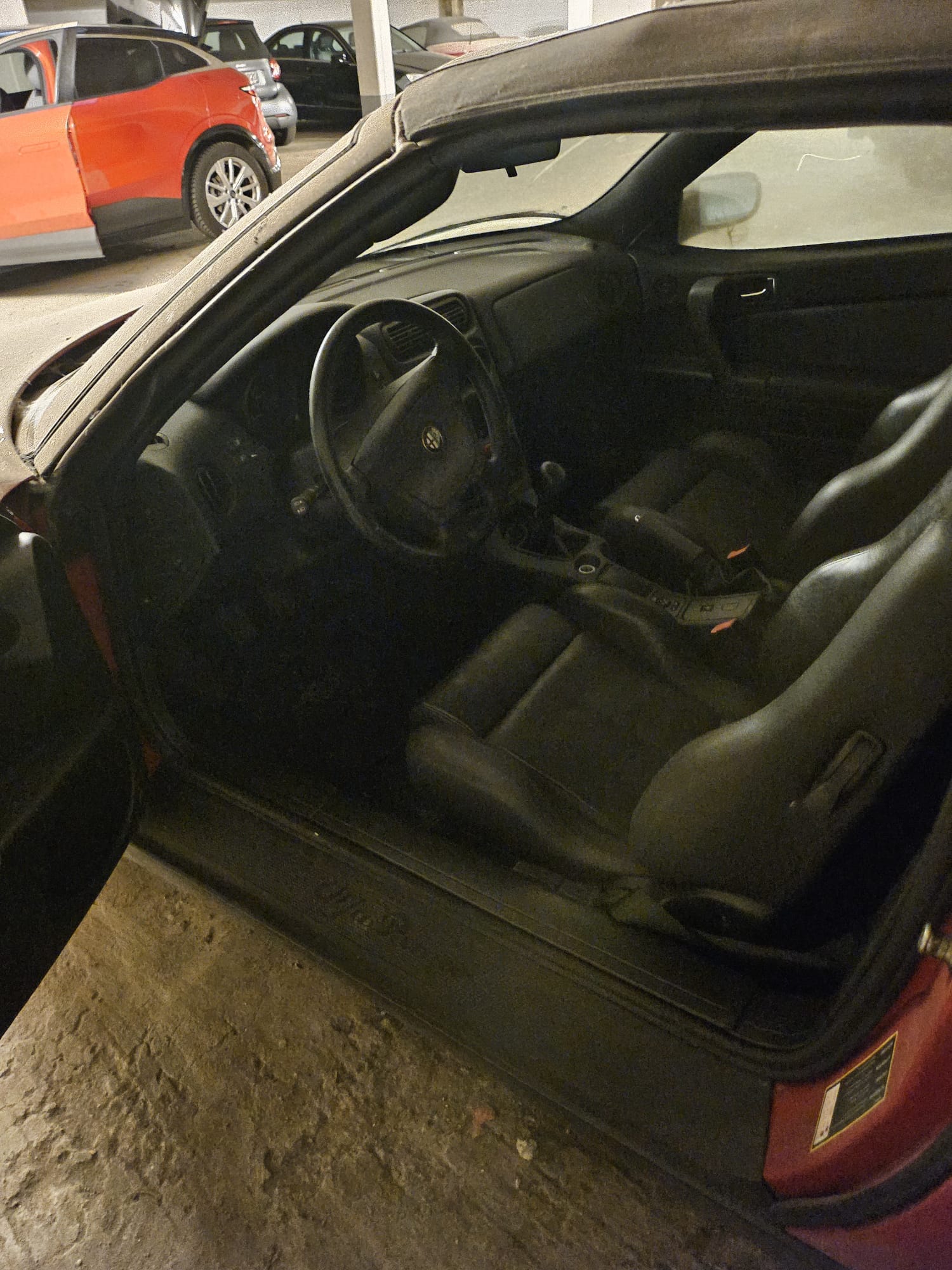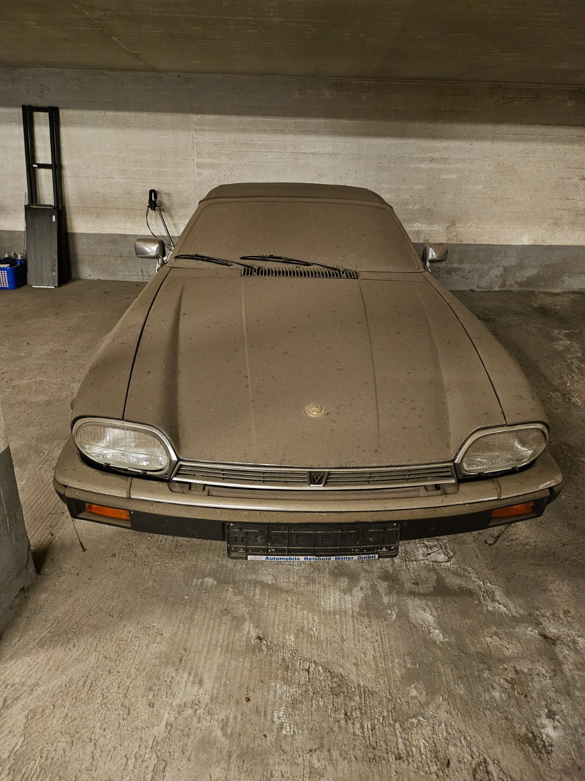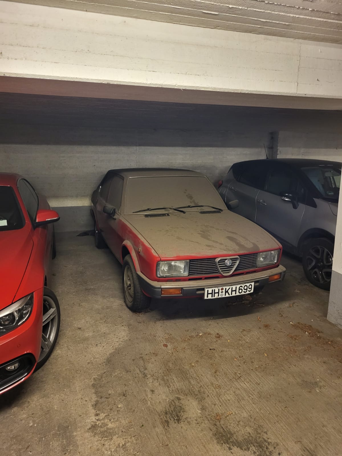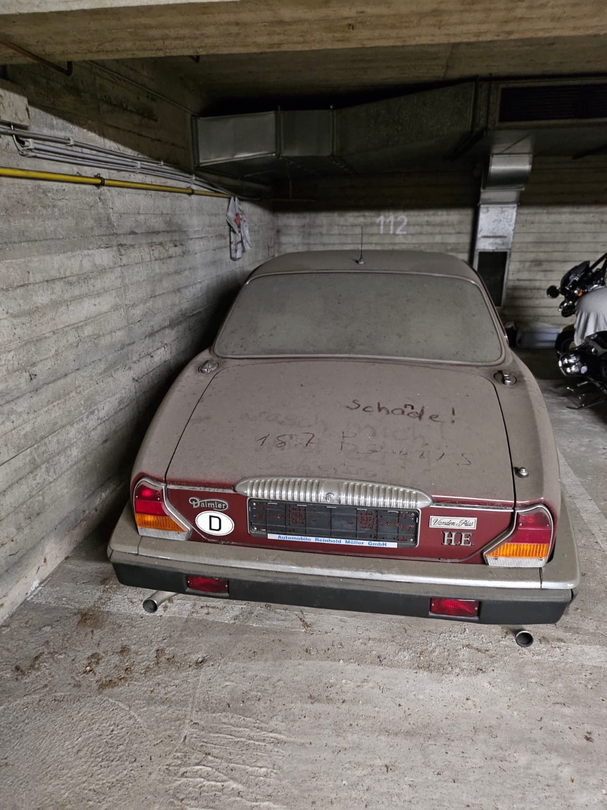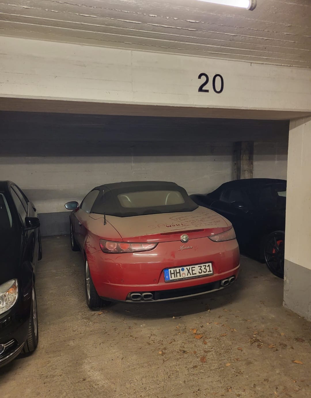 Die Tiefgarage ist nummeriert, betoniert und eher schlicht, mit engen Stellplätzen. Neben den Fahrzeugen sind vereinzelt Motorräder und moderne Autos zu sehen, was den Kontrast zwischen Alltagsfahrzeugen und Sammlerautos verstärkt.