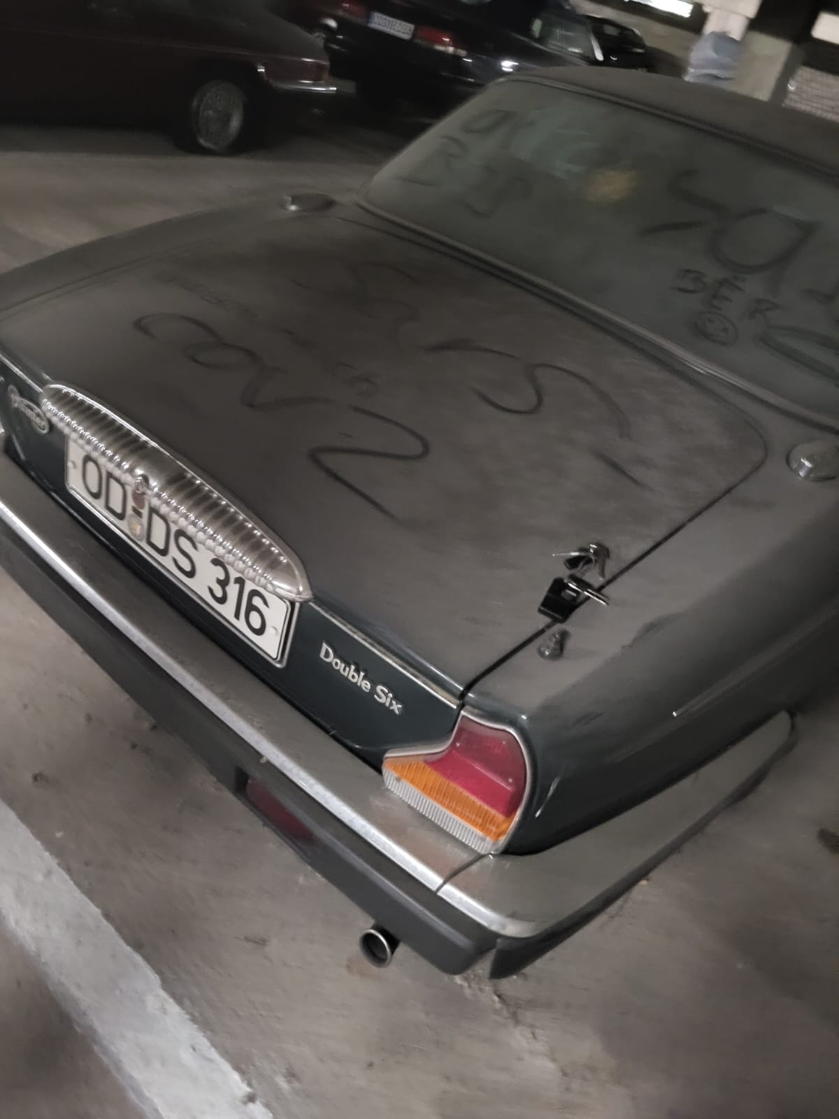 Mehrere Fahrzeuge, überwiegend ältere und klassische Modelle, die in einer Tiefgarage abgestellt sind. Viele der Autos sind stark eingestaubt, was darauf hindeutet, dass sie über einen längeren Zeitraum nicht bewegt wurden. Es handelt sich größtenteils um Coupés, Limousinen und Cabrios, teils mit Stoffverdeck.